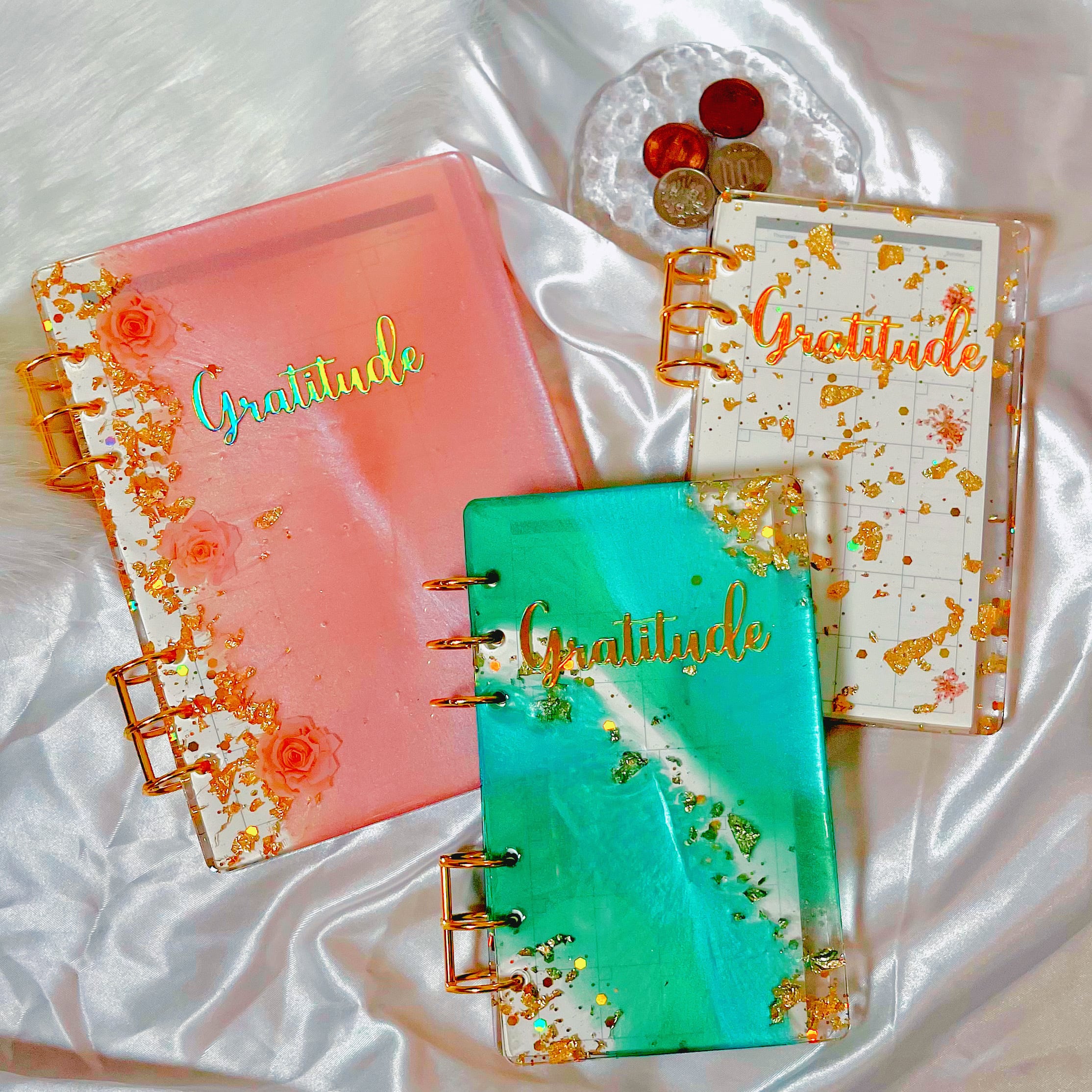 こちらはA5サイズのカスタムバインダー作品になります。 サイズはA5サイズ(縦21.4cm x 横15.4cm) ノート用紙、カレンダー用紙付です。 下記の項目をお選びいただけます。 •文字(ローマ字10文字まで) •文字のお色(ゴールド/シルバー) •金箔のお色(ゴールド/シルバー/ローズゴールド) •レジンの色味(なるべく詳しく頂けると理想に近いものをお作りできます) •リングのお色(ゴールド/シルバー/ローズゴールド) カスタム作品は制作に約1ヶ月ほどお時間をいただきます。 ※一つひとつ手作業でお作りしているため、わずかなズレやスレが見られる場合がございます。ハンドメイドならではの風合いとしてご理解いただけますと嬉しいです。完璧をお求めの方はご購入をお控えくださいませ。